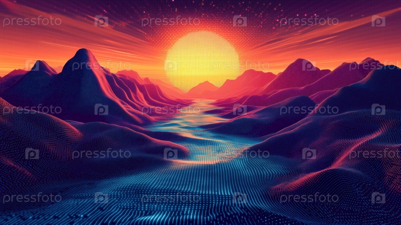 Футуристическая цифровая долина со светящейся рекой под лучистым закатом