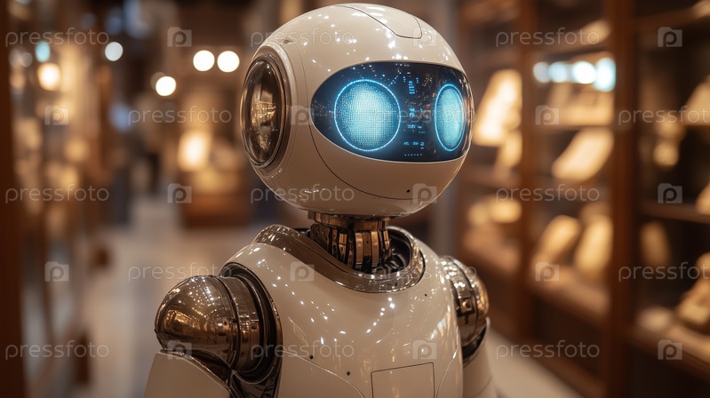 Футуристический гуманоидный робот со светящимися голубыми глазами в музее