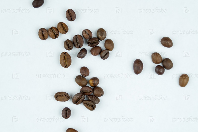 Жареные кофейные зерна, разбросанные по белой поверхности