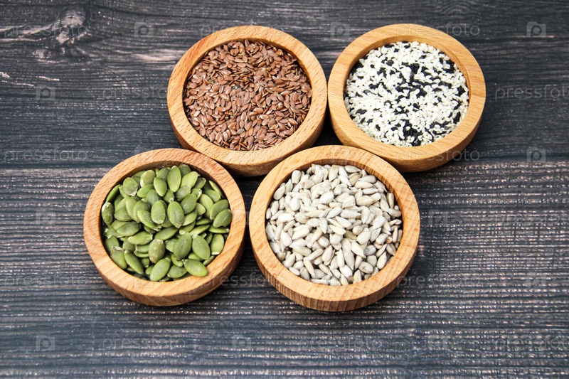 Деревянные блюдца с семенами на темном фоне. Темный стол украшен изящными чашками с семенами льна, подсолнечника, кунжута и тыквенных семечек. Эти ингредиенты идеально подходят для выпечки