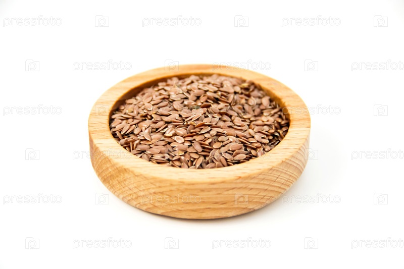 Семена льна в чашке, изолированные на белом фоне сверху. Приправа из семян льна в деревянной миске. Специи также выделены на белом фоне