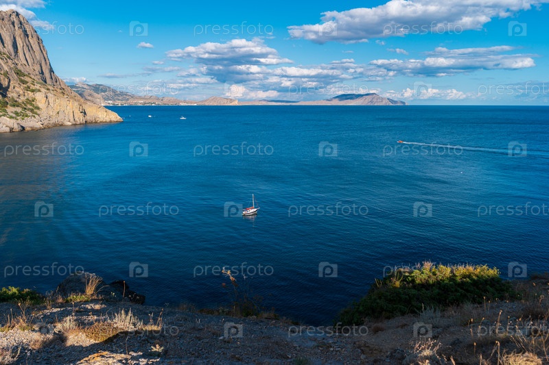 Вид с мыса Капчик, Крым. Черноморский пейзаж с прогулочной яхтой