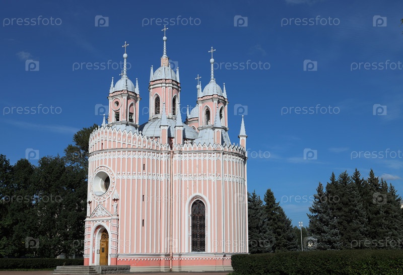 Санкт-Петербург, Россия, 21 августа 2024 г.: Чесменская церковь (церковь Рождества Иоанна Предтечи) на фоне голубого неба