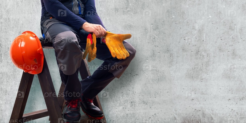 Работница надевает перчатки на руки у бетонной стены с местом для текста