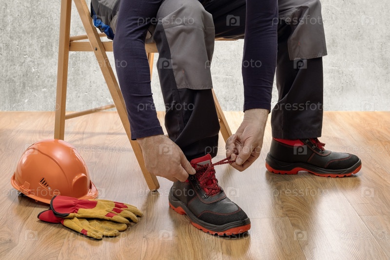 Рабочий надевает сапоги. Средства безопасности, защитная обувь
