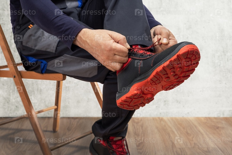 Рабочий завязывает шнурки на своих рабочих ботинках. концепция защитной обуви