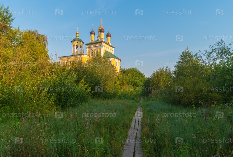 Муром, Россия. Живописный пейзаж с густой зеленью, деревянными мостками и видом на церковь Николая Чудотворца (Николо-Набережная)