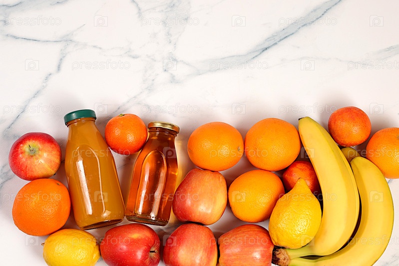 Здоровые веганские продукты для здорового образа жизни. Яблоки, апельсины, лимоны, мандарины, бананы и натуральный сок на бетонном фоне, концепция детокс-диеты и потери веса, реклама магазина