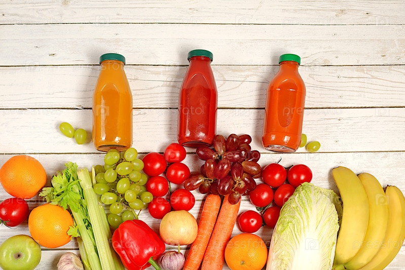 Натуральные соки и виноград, апельсины, помидоры, яблоки, бананы, капуста, сельдерей и на деревянном фоне, детокс-диета и концепция потери веса, здоровые веганские продукты для здорового образа жизни