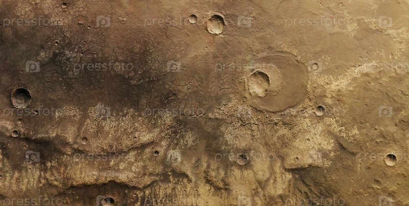 Крупным планом вид на поверхность Марса, на которой видны кратеры, следы ударов и уникальные геологические образования