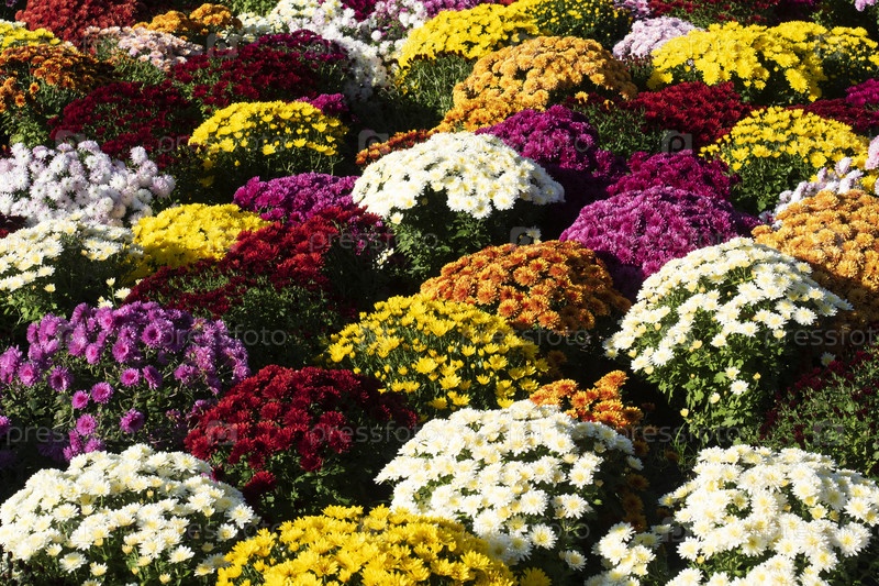 Великолепный ковер из свежих разноцветных хризантем в парке в солнечный день. Цветочное городское озеленение. Концепция летнего садоводства. Цветочная текстура. Вид сверху, крупный план,