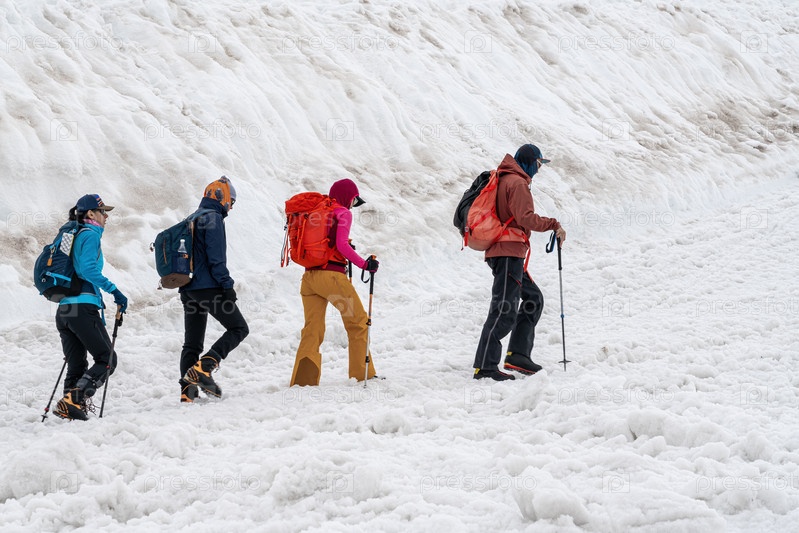 Группа туристов, путешествующих по заснеженной местности в горном регионе