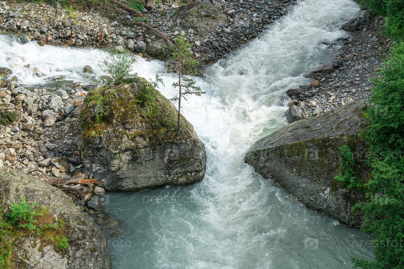 Бурные речные воды текут между скалистыми берегами среди пышной зелени
