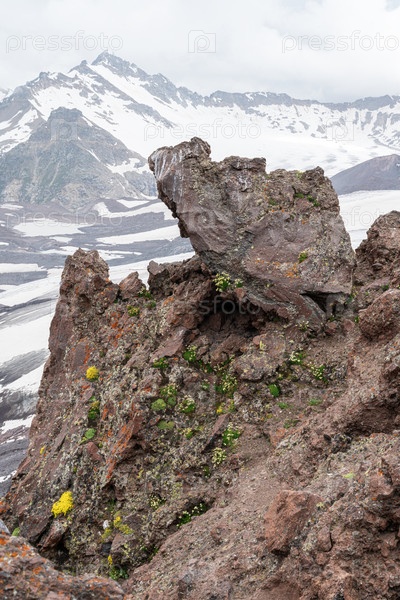 Красивый скалистый пейзаж с заснеженными горами на заднем плане