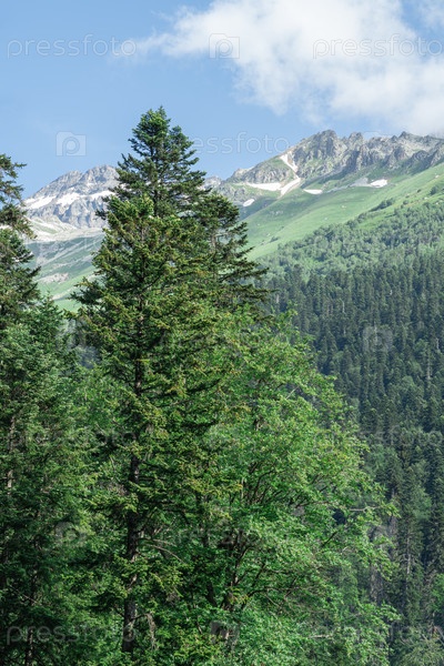 Величественный горный пейзаж с пышными зелеными деревьями под ясным голубым небом