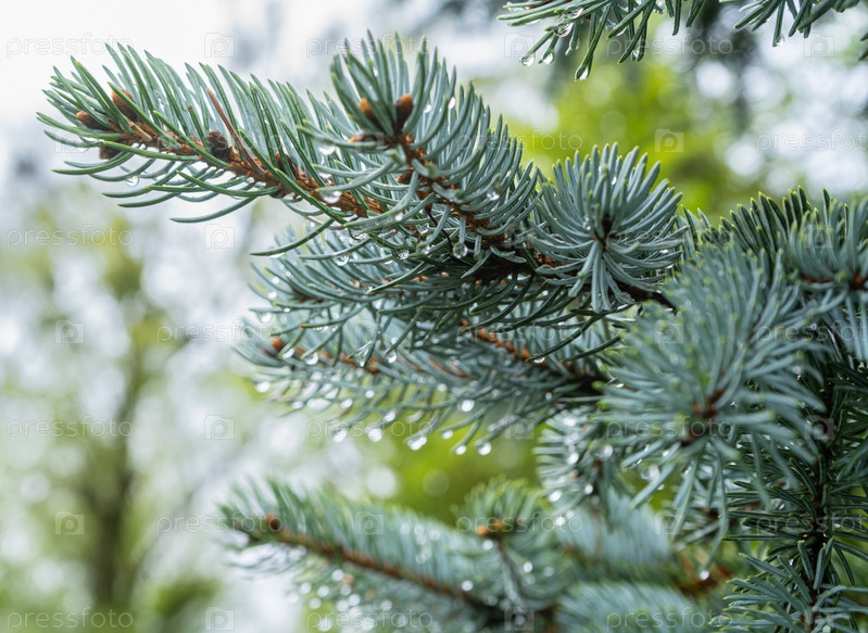 Ветки голубой ели с каплями дождя