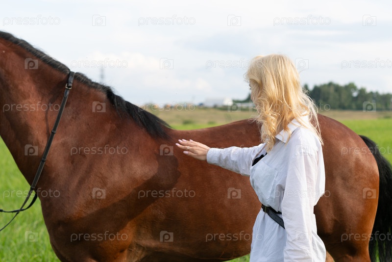 Молодая красивая женщина позирует в поле с лошадью