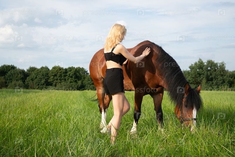 Молодая красивая женщина позирует в поле с лошадью