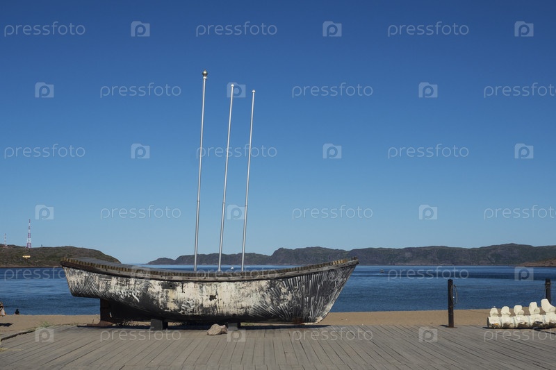 Териберка, Россия, 8 августа 2024 г.: Старый деревянный корабль на городском пляже