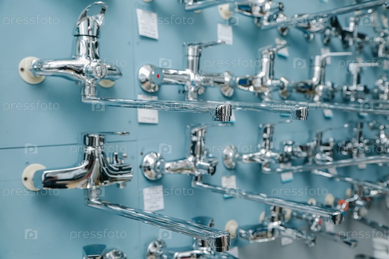 Смесители висят на стене в магазине / Faucets are hanging on the wall in the store