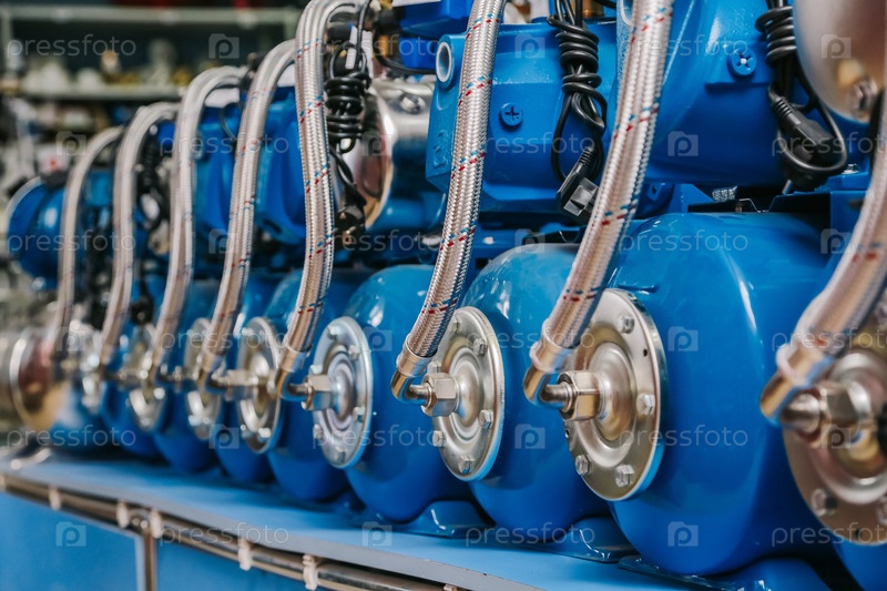 Синие водяные насосы с металлическими шлангами, стоящие в ряд в магазине / Blue water pumps with metal hoses, standing in a row in the store