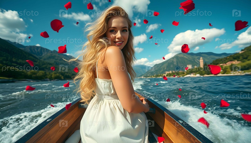 Молодая красивая женщина в деревянной лодке на реке Генеративный искусственный интеллект