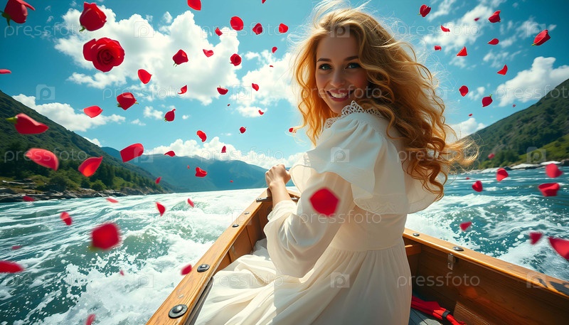 Молодая красивая женщина в деревянной лодке на реке Генеративный искусственный интеллект