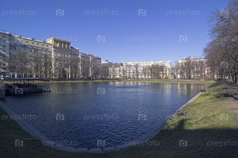 Патриарший пруд солнечным апрельским утром. Москва, Россия