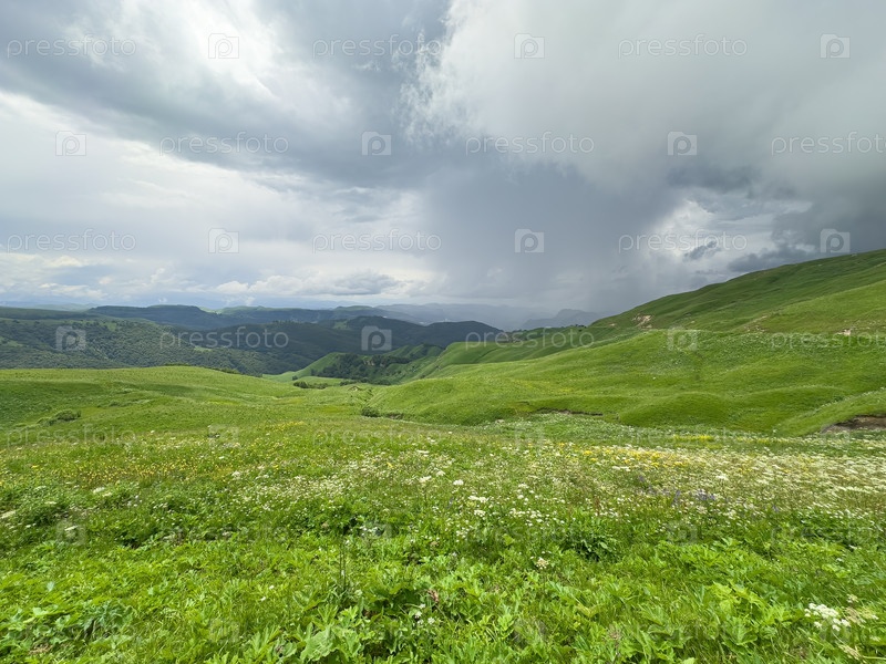 Пышный зеленый холмистый ландшафт под грозовыми облаками