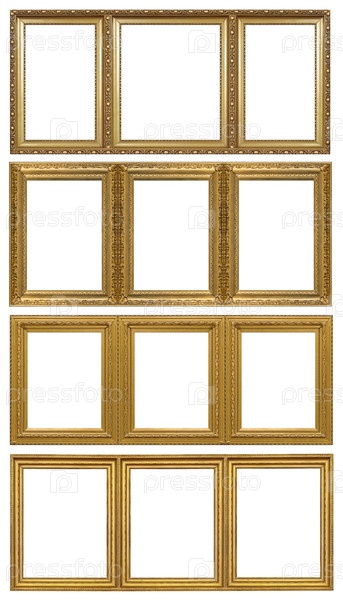 Набор золотых рам для картин, зеркал или фотографий на белом фоне
