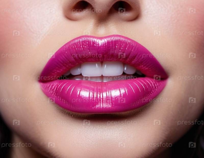 Крупный план женских губ с мерцающей пурпурно-розовой помадой, которая добавляет немного блеска. Губы слегка приоткрыты, открывая вид на белые зубы. Чувственность и сексуальность. Создано с помощью ИИ
