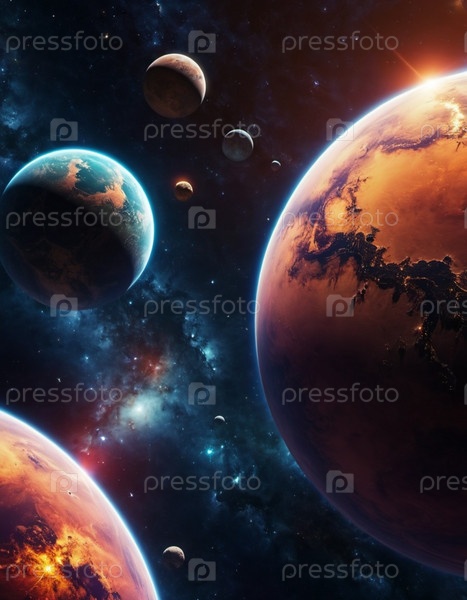 Планетарная система с несколькими планетами, большим ярко окрашенным газовым гигантом и каменистой планетой. Яркие звезды и огромное пространство темного космоса с галактикой на заднем плане. Космические просторы. Космонавтика. ИИ