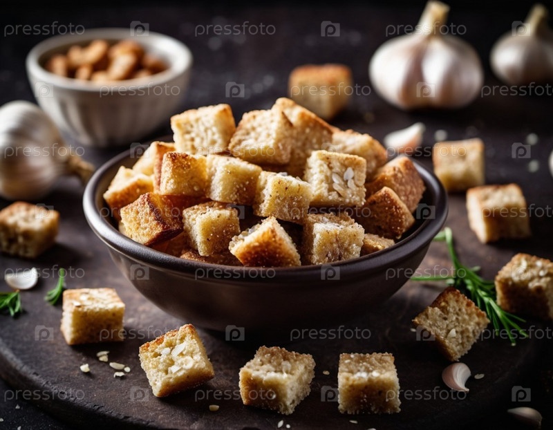 Запеченные ржаные гренки солят и настаивают на чесноке, создавая пикантную закуску, художественно оформленную в глубокой коричневой миске, окруженную. Мягкая начинка. Идеально подходит для супов, салатов или закуски к пиву