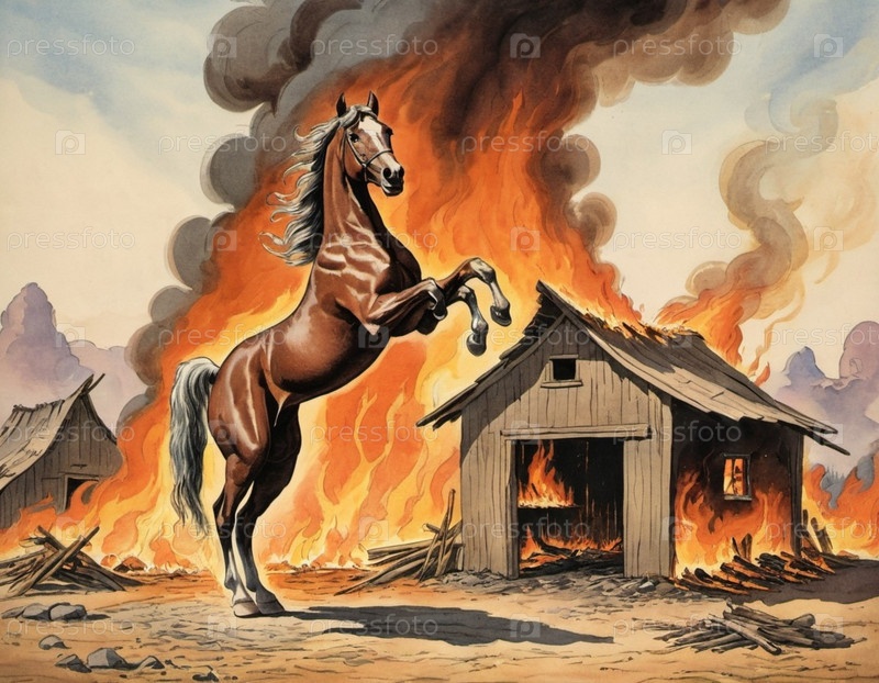 Лошадь встает на дыбы среди сильного пламени и густого дыма, которые окутывают деревянную избу. Огонь потрескивает. Русская пословица: есть женщины в русских деревнях, которые могут остановить коня на скаку и войти в горящую избу