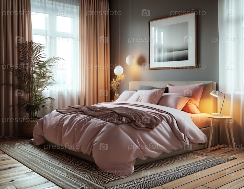Эта скандинавская спальня демонстрирует удобную кровать с многослойным постельным бельем, стильные растения и минималистский декор, предлагающий умиротворяющую атмосферу. Зеленые стены