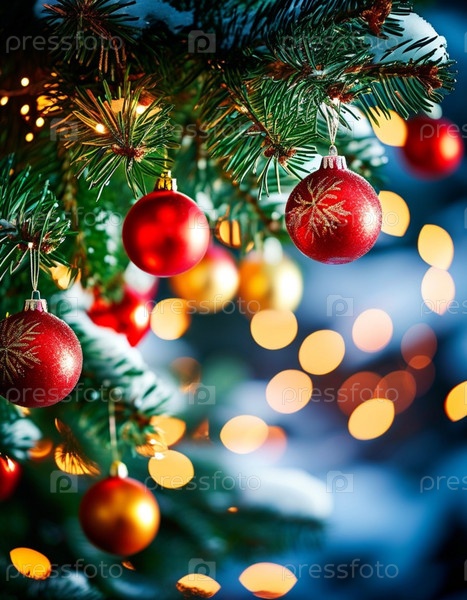 Сверкающие шары для украшений в ярких красных и золотых тонах свисают с пышной еловой ветки. Мягкие, теплые огни мерцают, усиливая праздничный дух Рождества. С Новым годом. Анаморфное боке. Генеративный ИИ