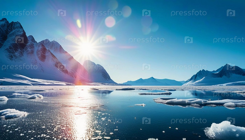Спокойный арктический пейзаж тундры окутан инеем, когда встает солнце, проливая золотистый свет на ледяную местность и освещая нежные ледяные образования. Генеративный ИИ