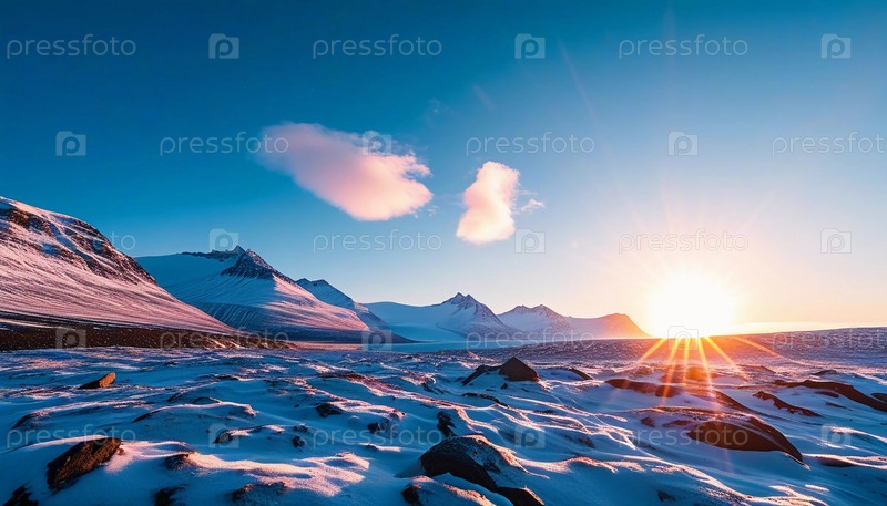 Спокойный арктический пейзаж тундры окутан инеем, когда встает солнце, проливая золотистый свет на ледяную местность и освещая нежные ледяные образования. Генеративный ИИ