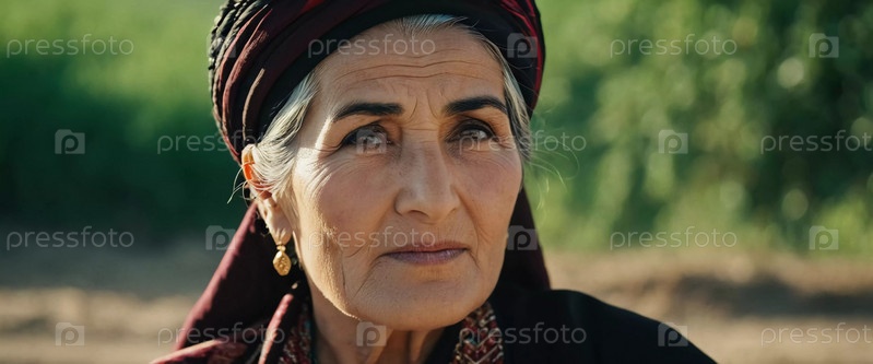 Зрелая таджикская женщина 75 лет, смотрит прямо, демонстрируя сложную традиционную одежду, богатое культурное наследие своей национальности, пробуждая мудрость и изящество. Брюнетка, в платке. AI