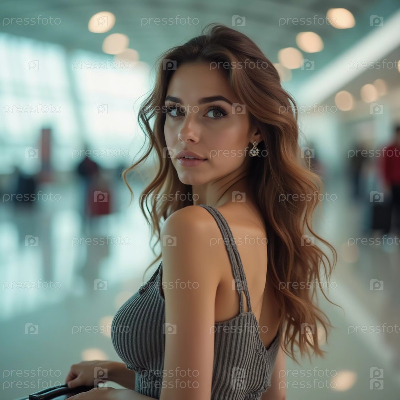 Стильная брюнетка стоит в аэропорту, держа чемодан и оглядываясь назад с уверенным выражением лица. Путешественники суетятся вокруг нее, пока она ждет, одетая в повседневную облегающую одежду. Генеративный ИИ