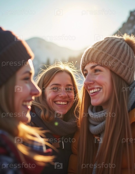 Молодые друзья собираются в зимней стране чудес, разделяя радостные моменты и смех под ярким солнцем. Они щеголяют в уютной зимней одежде, подчеркивая свое веселое приключение. Генеративный ИИ
