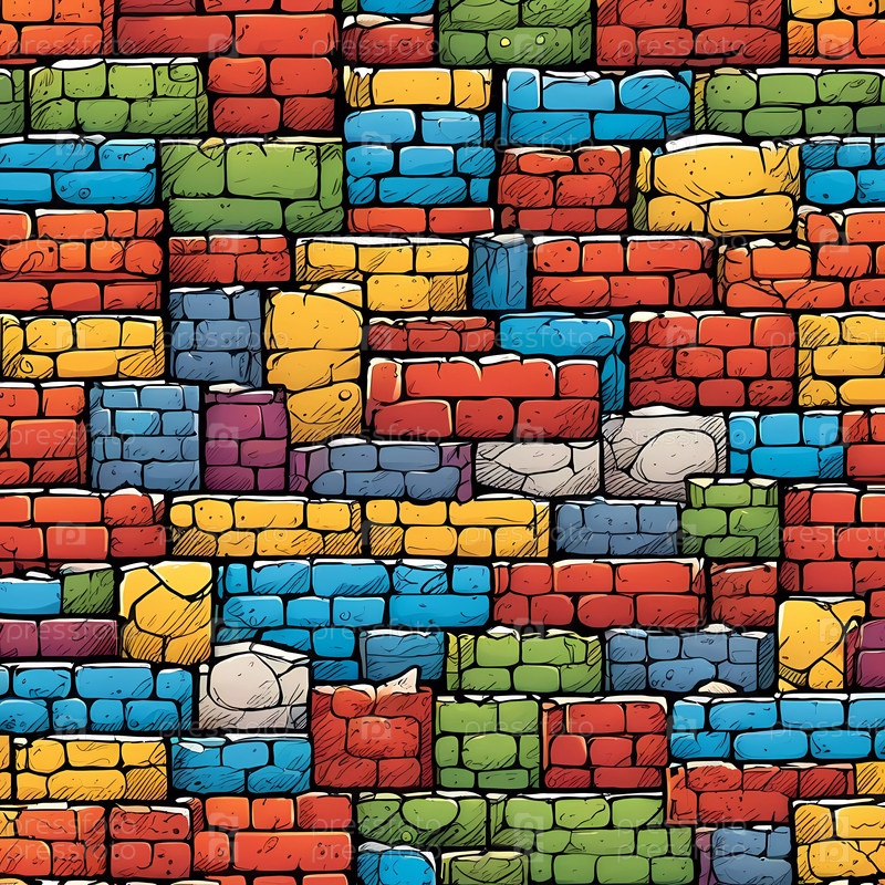 Эта яркая кирпичная стена демонстрирует множество цветов, включая красный, желтый, бирюзовый и фиолетовый. Дизайн отражает художественный подход, часто встречающийся в городской среде. Генеративный ИИ