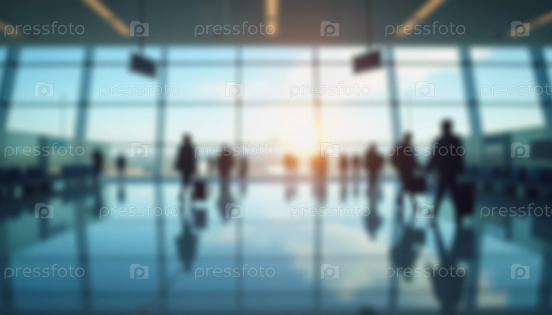 Толпы путешественников перемещаются по просторному терминалу аэропорта, занимаясь различными видами деятельности и готовясь к предстоящим рейсам в утреннем или вечернем свете. Расфокусированное боке. Генеративный ИИ