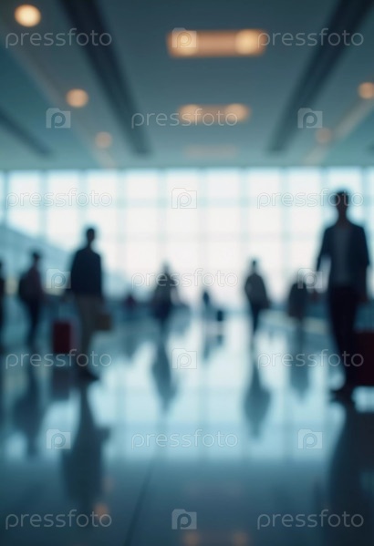 Толпы путешественников перемещаются по просторному терминалу аэропорта, занимаясь различными делами и готовясь к предстоящим рейсам в утреннем или вечернем свете. Расфокусированное боке. Генеративный ИИ