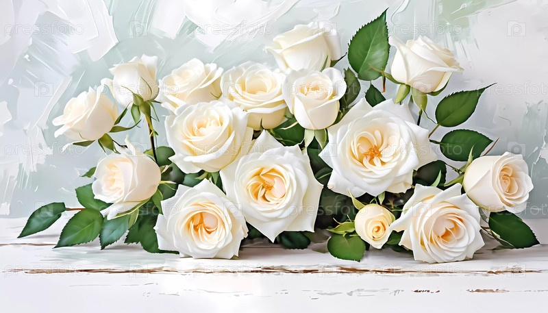 Потрясающая композиция из белых роз разного размера, подчеркнутая свежими зелеными листьями. Этот букет добавит очарования и элегантности любой обстановке, идеально подходит для празднования особых моментов. Генеративный ИИ