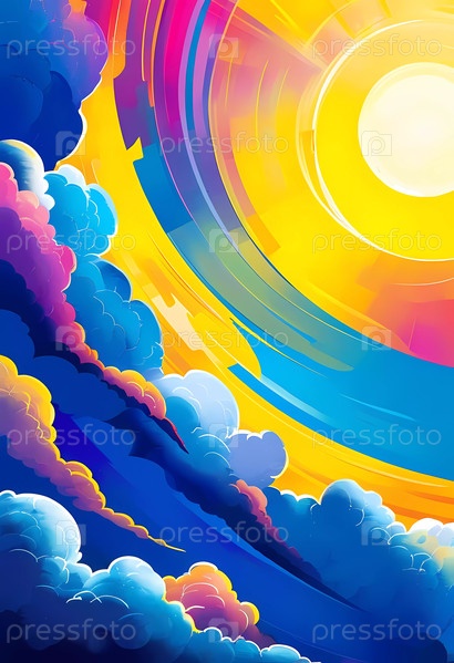 Яркое солнце светит в небе, заполненном разноцветными облаками, создавая живую атмосферу. Оттенки синего, желтого и розового прекрасно сочетаются, усиливая безмятежную атмосферу после полудня. Генеративный ИИ