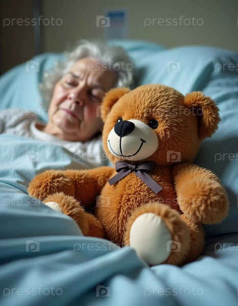В тихой больничной обстановке пожилая женщина мирно лежит в постели, находя утешение в присутствии мягкого плюшевого мишки рядом с собой