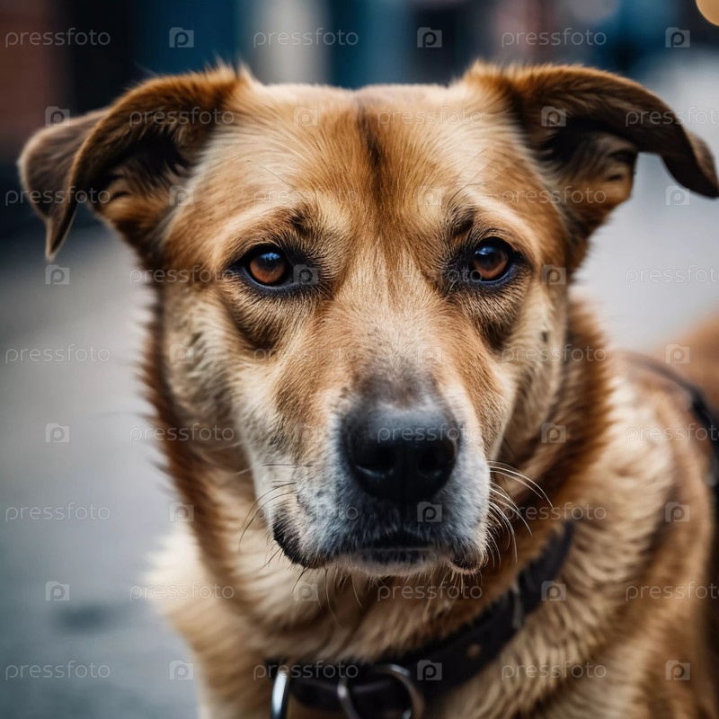 Любопытная собака уверенно стоит на мощеной улице, окруженной красочными зданиями в оживленном городе. Теплый солнечный свет отражается от поверхностей, освещая выразительные глаза собаки AI