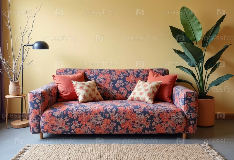 Яркий цветочный чехол для дивана оживляет уютную гостиную, украшенную лиственными растениями и теплым светом. Мягкие подушки располагают к отдыху в веселом, хорошо оформленном пространстве