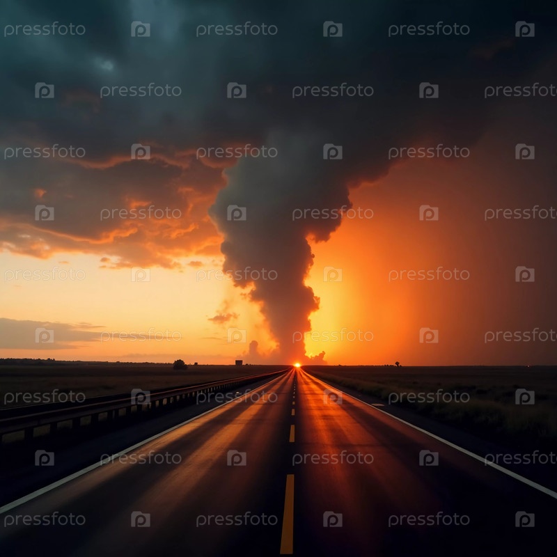 Темные грозовые облака сходятся, захватывая огненный закат, пока вдалеке формируется торнадо. Пустая дорога ведет к мощному проявлению природы погоды в действии Генеративный ИИ